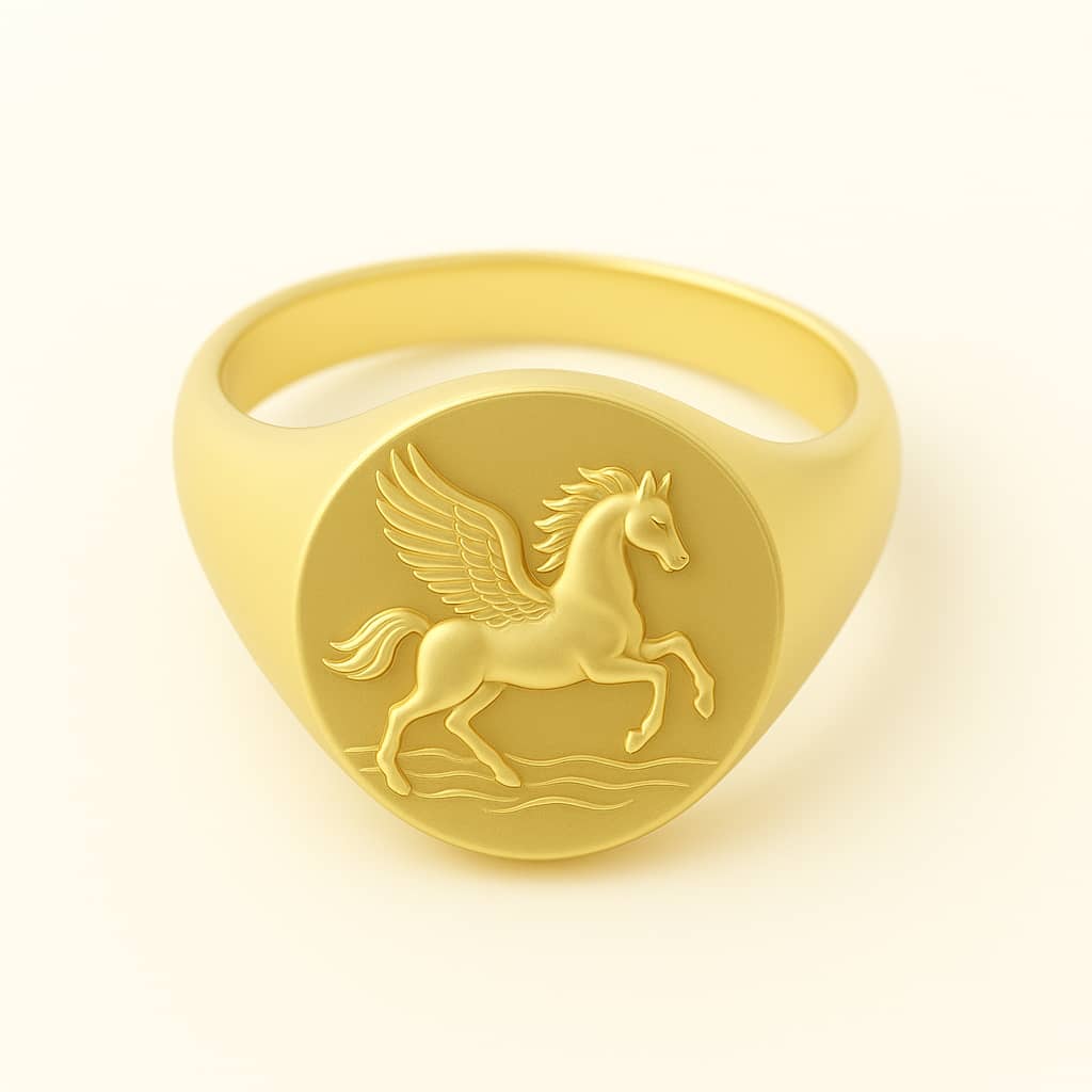 In a city where ambition takes flight, this ring is your symbol of elevation.Crafted in solid 14K gold, the Pegasus Signet Ring features a dynamic winged horse in mid-motion—wings spread, hooves raised, standing above stylized waves. It’s a tribute to freedom, divine strength, and creative fire, designed for men who rise above limits.