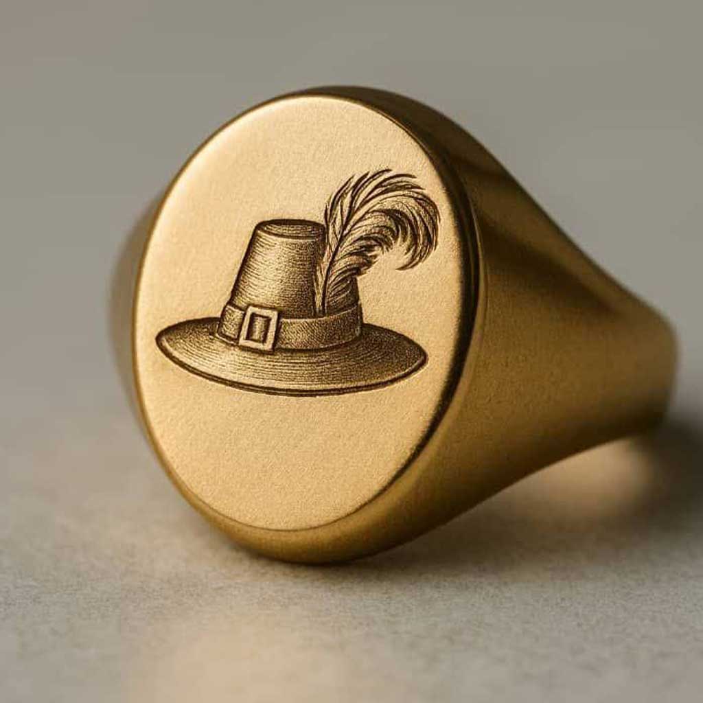 In a world of fleeting trends, some symbols endure. This 14K gold Pilgrim Signet Ring is a tribute to timeless prestige—where craftsmanship meets cultural legacy. Featuring a finely engraved pilgrim-style hat with buckle and feather, it evokes the spirit of exploration, conviction, and quiet power.