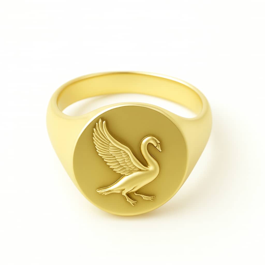 In a city of bold moves and sharp edges, this ring offers a moment of quiet elegance.Crafted in solid 14K gold, the Swan Signet Ring features a finely embossed swan in mid-stride—wings extended, feathers detailed, and presence undeniable. It’s a tribute to grace, transformation, and inner strength, designed for men who lead with calm conviction.