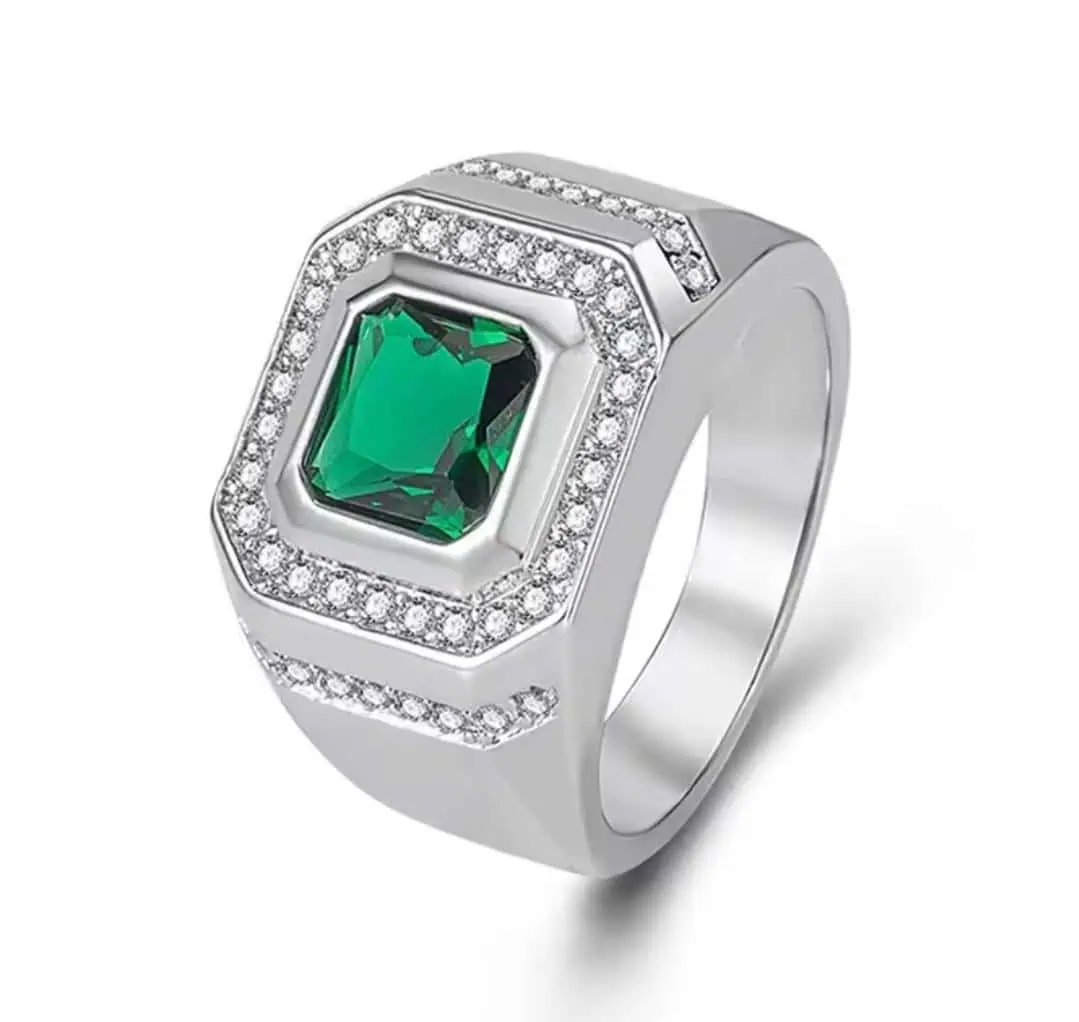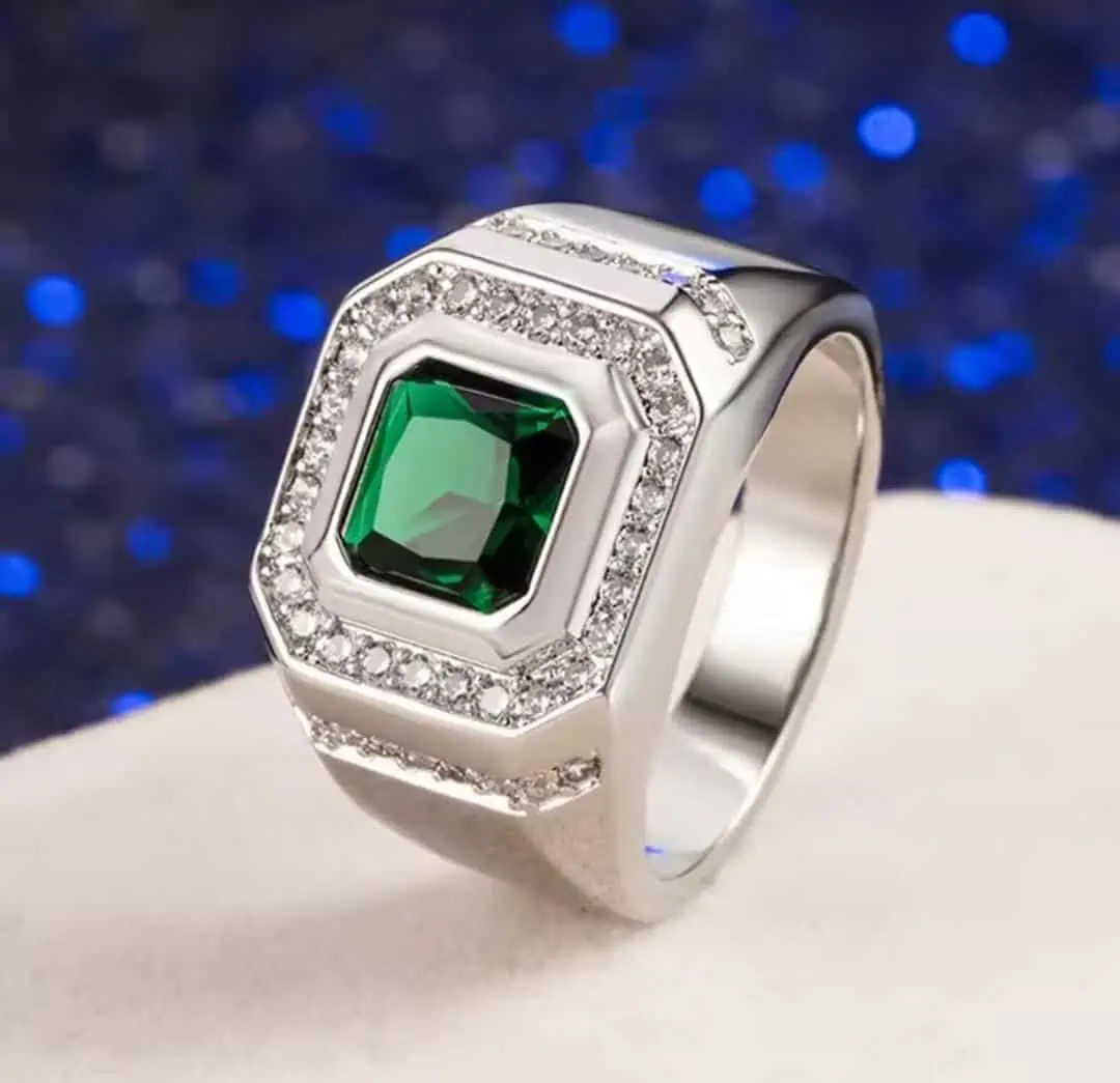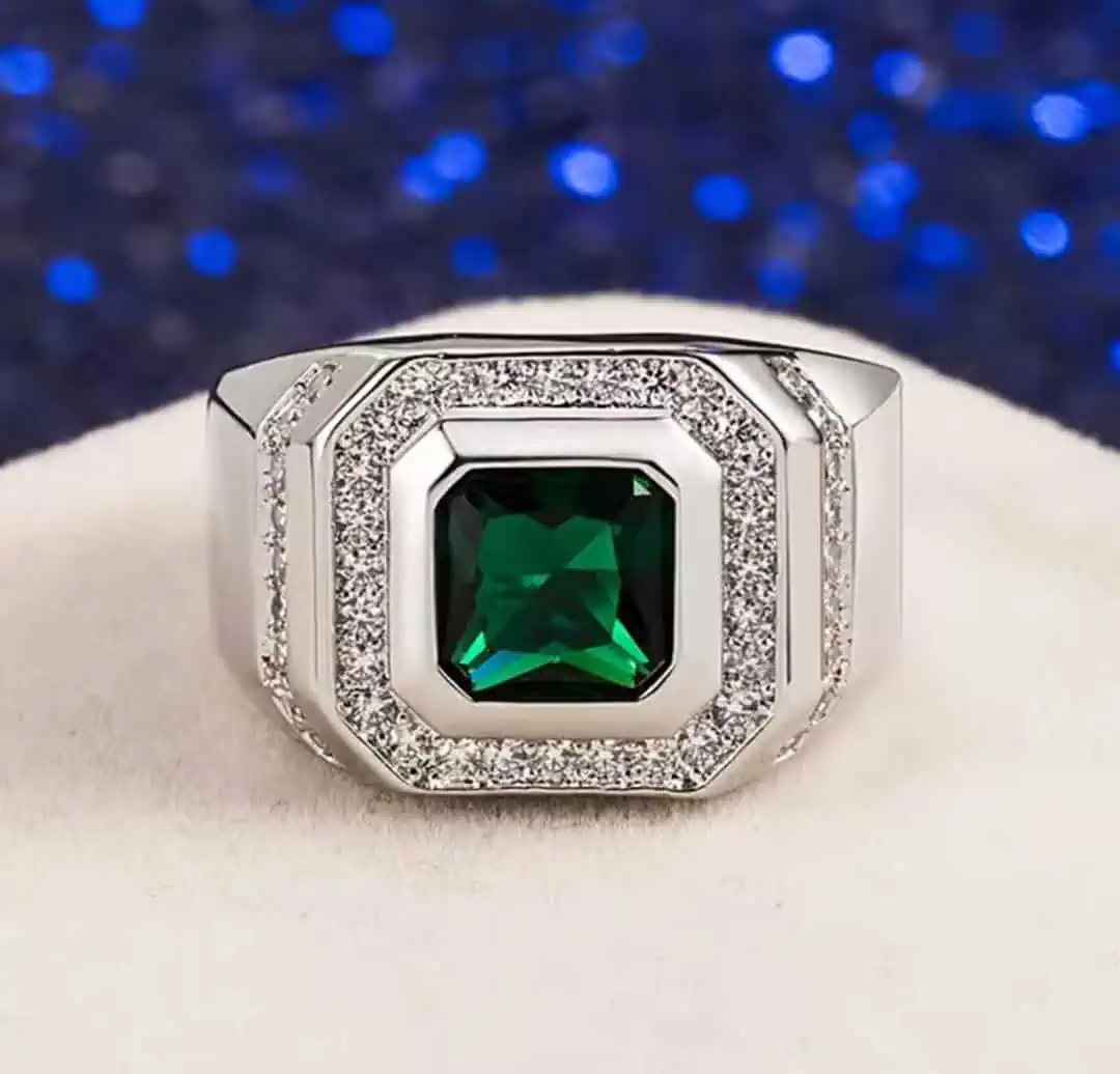 This ring is perfect for men who want modern luxury with classic refinement. Its bold emerald stone and elegant metalwork make it suitable for business meetings, celebrations, and daily wear. The structure and finish emulate the quality associated with genuine 18K White Gold, ensuring a rich appearance and long-lasting brilliance.