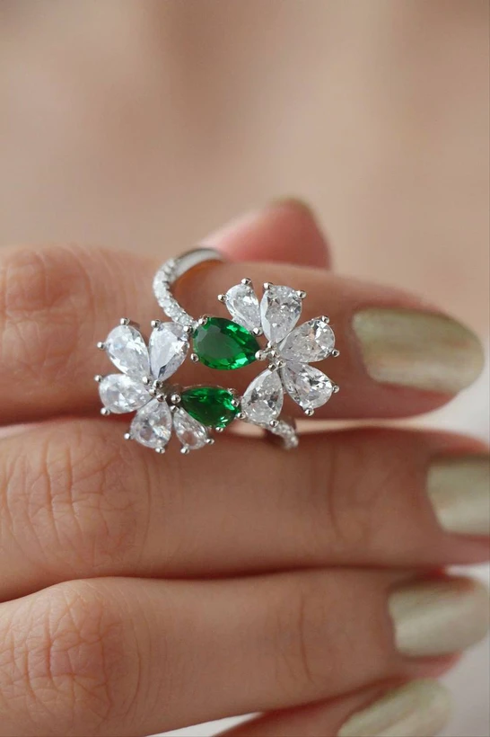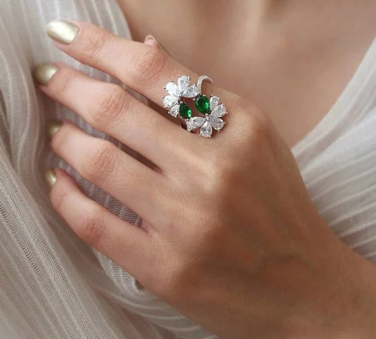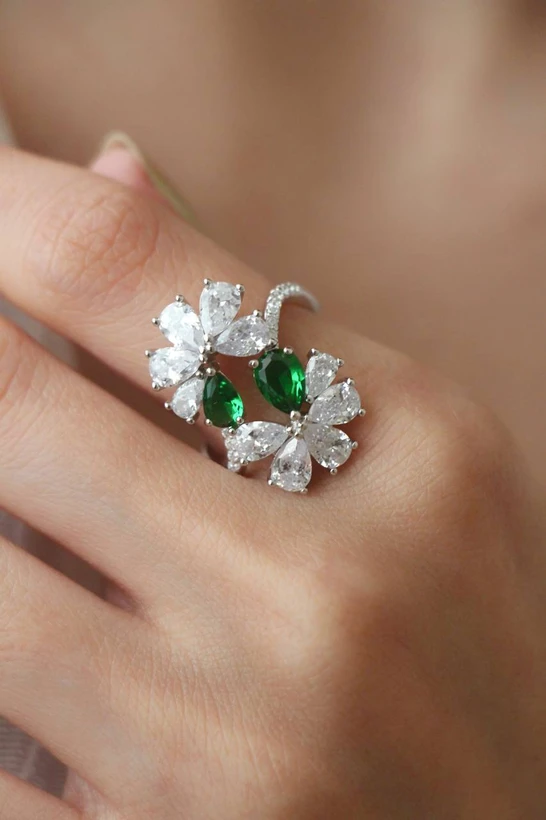 Pair the Double-Sided Floral Ring with casual or formal outfits to instantly elevate your look. The Women’s Double Floral Emerald Ring adds a touch of natural beauty and sparkle to your hand, ensuring everyone notices its charm. This ring is truly a statement piece for those who value artistry, elegance, and a love for nature.