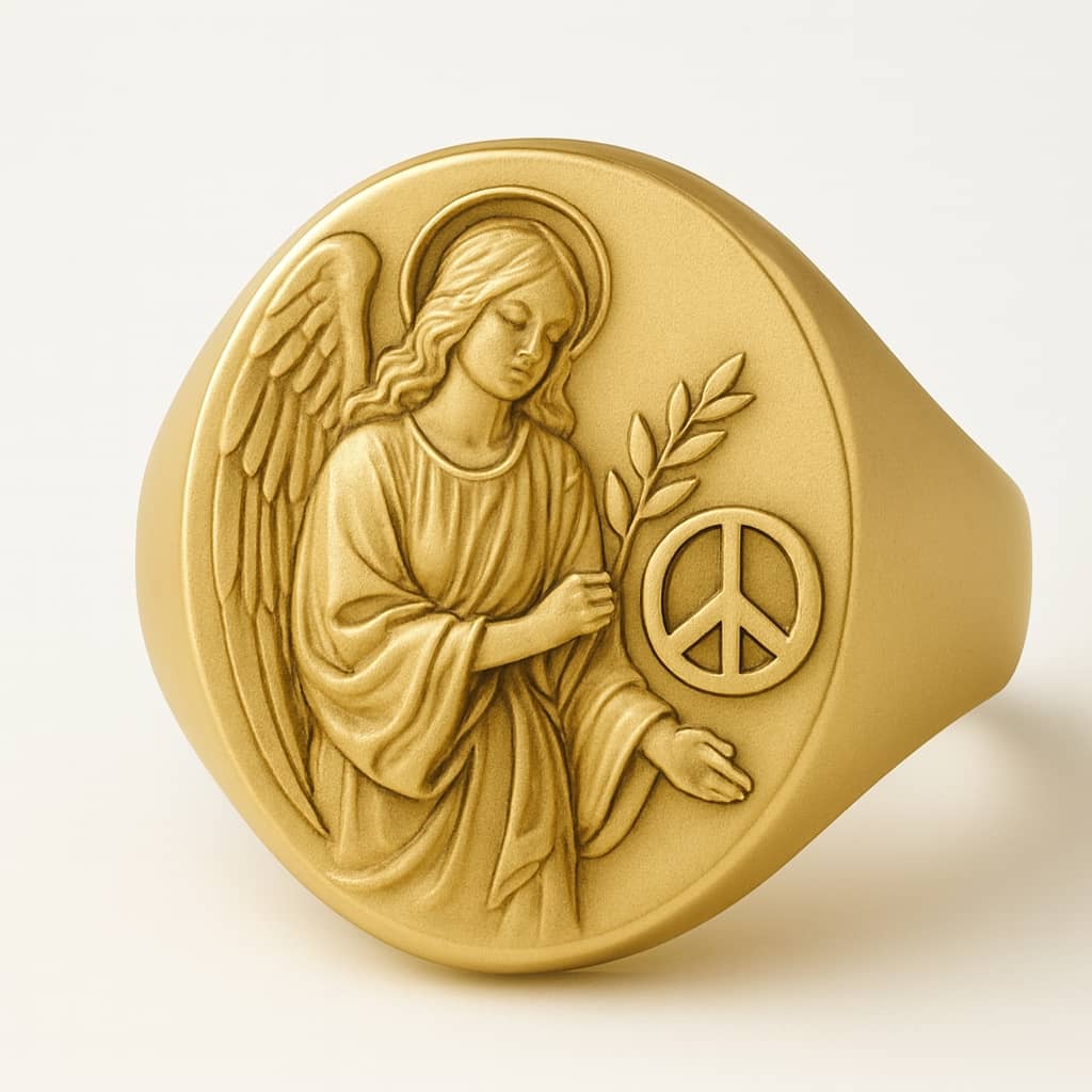 This premium golden ring showcases an intricately sculpted angel figure holding an olive branch alongside a peace symbol. Designed with refined artistic detail, the ring represents peace, protection, and spiritual harmony.