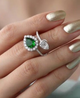 The deep green of the emerald makes this emerald jewelry ring a versatile accessory. It pairs beautifully with classic black, white, or navy outfits, and creates a soft, elegant look with pastel tones like blush pink or lavender. To make a bold impression, pair it with deep, rich colors like burgundy or dark purple. The ring’s marquise-cut emerald catches the light beautifully, adding sophistication to any ensemble.