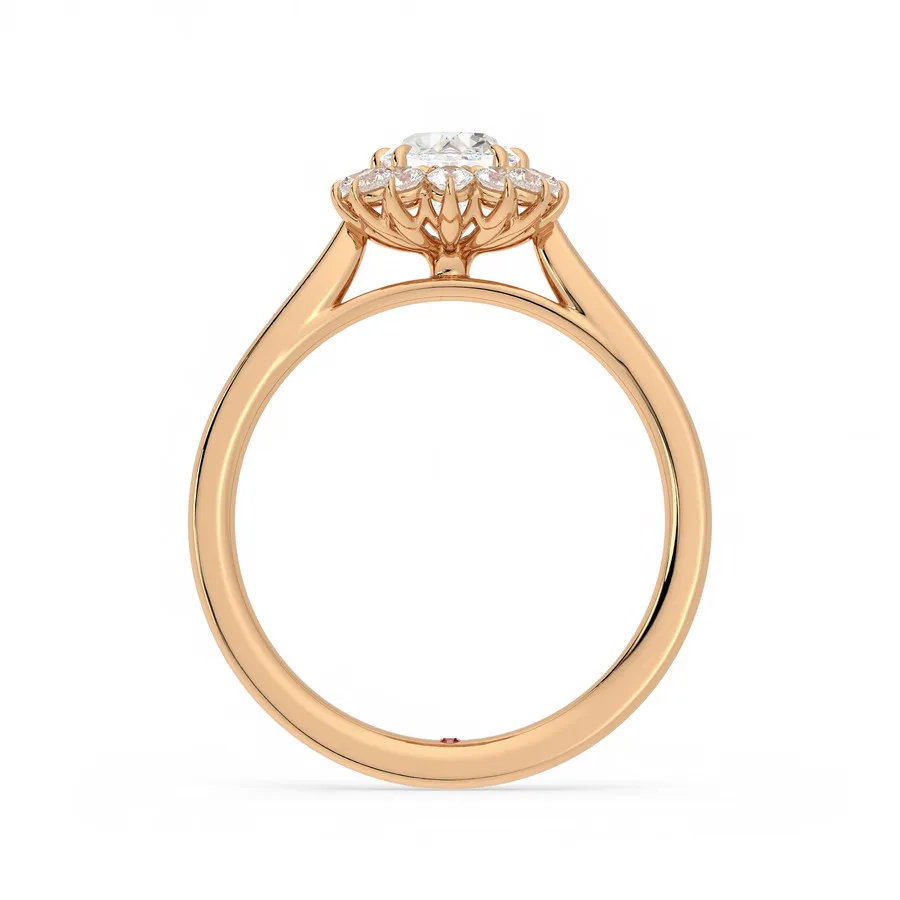 Oval diamond centre and floral diamond halo engagement ring set in 18ct rose gold