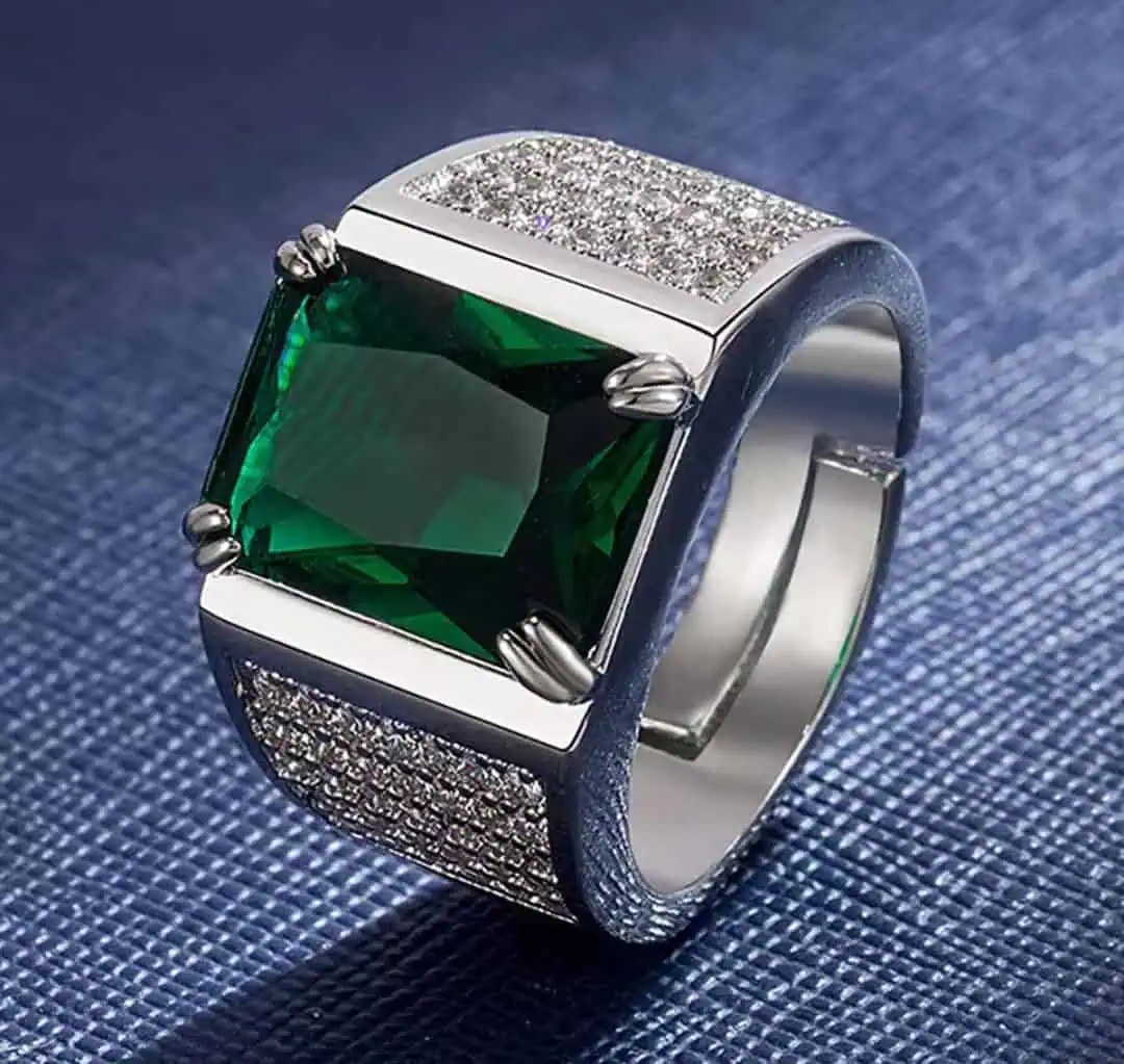 Masculine Green Crystal Emerald Gemstones Ring for Men – 18K White Gold Color