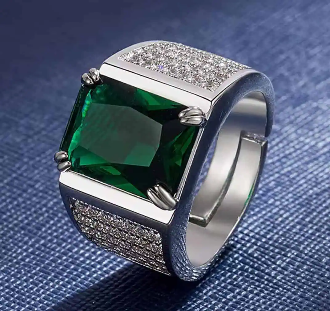 Created with durability in mind, the structure features a premium silver-tone finish that mirrors the brilliance of authentic 18K White Gold. The center crystal is cut for maximum shine, creating an eye-catching focal point. Small diamond-style stones accent the design, adding extra sparkle without overpowering the elegant aesthetic. Whether you’re building a refined jewelry collection or searching for a standout accessory, this men’s emerald ring offers the ideal balance of sophistication and affordability.
