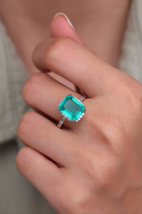 The Emerald Ring features a beautifully cut medium square emerald that stands out with its vibrant green color. Its gold setting enhances the gemstone’s brilliance, making it a perfect choice for women who love sophisticated and noticeable jewelry.