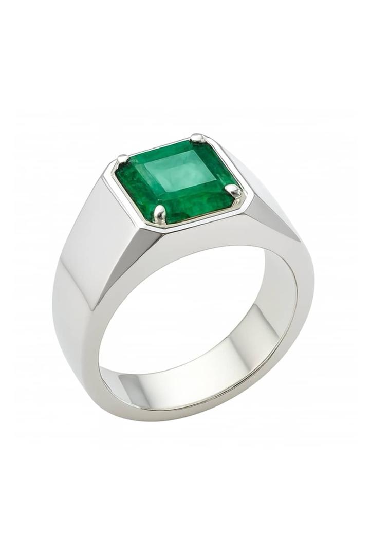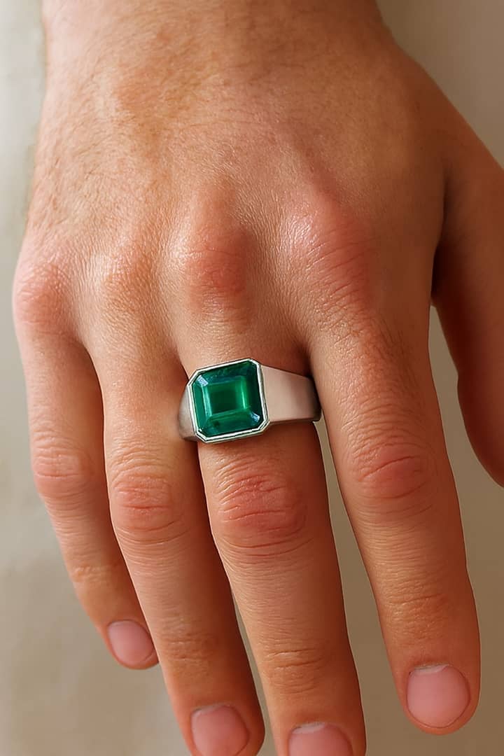 Unlike overly detailed rings, this piece focuses on balance and clean lines. The emerald gemstone symbolizes power, growth, and clarity, making it a meaningful choice for modern men.